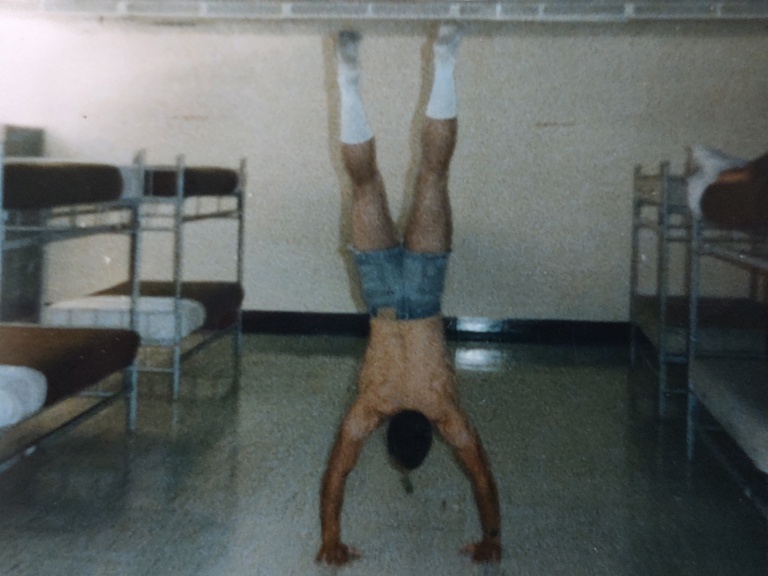 Brian Kaess doing a handstand in Army Medic AIT 1985.