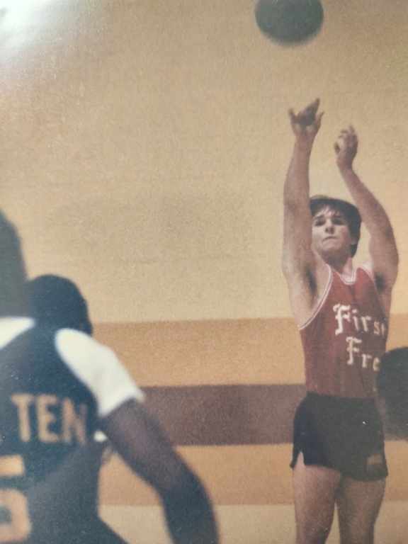 Brian Kaess shooting a jumper for First Evangelical Free Church (EFCA) high school basketball team in a Chicago-area game, late 1984.